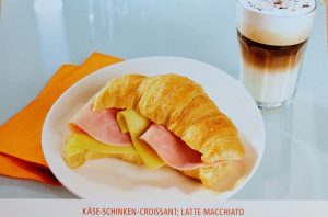 Hier seht ihr im Vergleich 1 Croissant (65 gramm) mit 10 gramm Butter, 15 gramm 48% Gouda und 15 gramm gekochten Schinken. Dazu als Getränk einen Latte Macchiato: 60 ml Espresso, 200 ml Vollmilch 3,5%, Zucker 10 gramm.