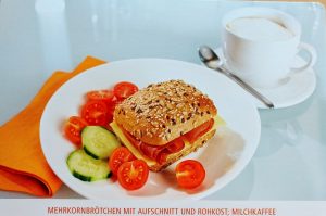 Die kalorienarme Alternative: 1 Mehrkornbrötchen (65 gramm) mit 40 gramm Gurke, 60 gramm Tomaten, 10 gramm Margarine, 40 gramm roher Schinken, 15 gramm Gouda 48%. Als Getränk einen Milchkaffee: 100ml Kaffee und 100ml fettarme Milch 1,5%.