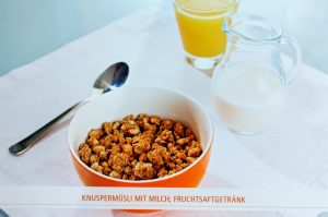 Hier seht ihr im Vergleich ein Knuspermüsli mit Milch und einem Fruchtsaft