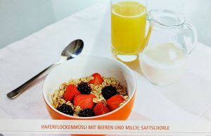 Die kalorienärmere Variante: Haferflockenmüsli mit Beeren und Milch und einer Saftschorle