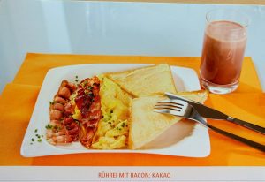 Hier seht ihr im Vergleich ein Rührei mit Bacon und dazu ein Kakao