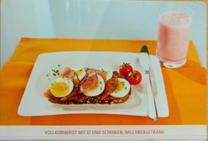 60 gramm Ei, 50 gramm Vollkornbrot, 5 gramm Margarine, 45 gramm Lachsschinken, 120 gramm Tomaten. Dazu ein Milchmixgetränk.